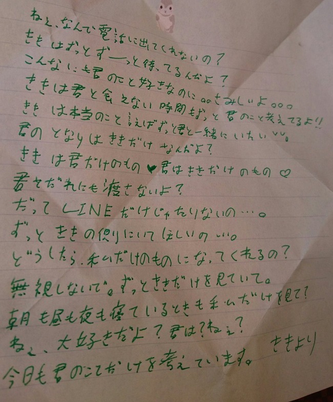 整封信洋溢著滿滿的佔有慾呢~只想要對方一直看著自己,變成只屬於自己的人,(當然我也是你的♥ )絕對不會讓給別人。感覺這位Kiki非常非常的喜歡對方,滿腦子都想著他,不過男生看了應該會很無奈吧...