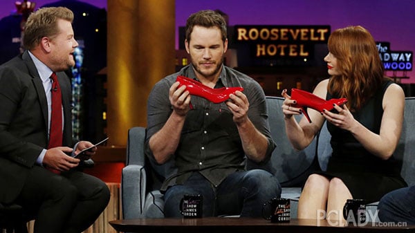 上節目宣傳時,在電影裡MAN味十足的性感男星Chris Pratt也穿上高跟鞋小跑步。盡責地為真正產品做宣傳