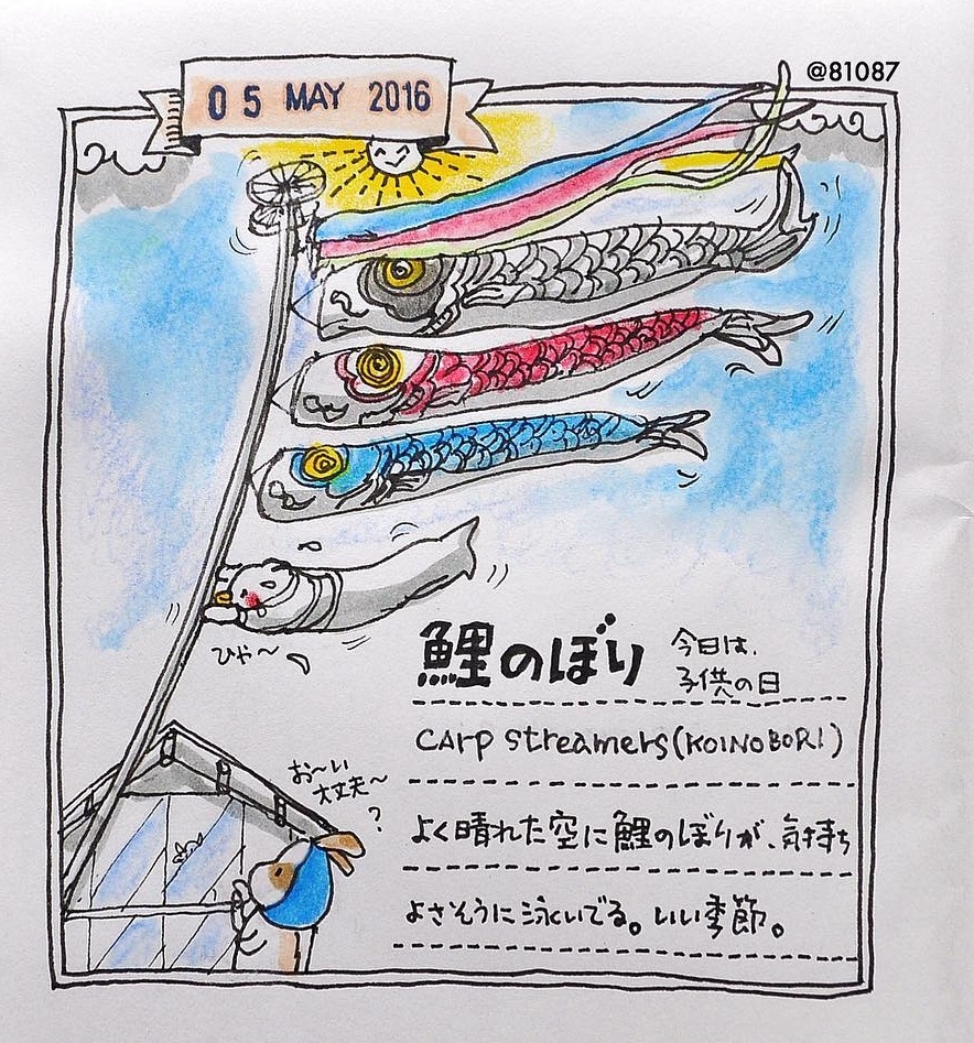 另外うさうさ在每個節慶也都畫特別的插畫,像是日本5月5日的兒童節,大街小巷都會掛滿可愛的鯉魚旗,是不是很可愛呢~(最下面那隻確定是鯉魚嗎?)