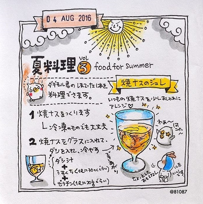 另外夏天不可少的就是冰冰涼涼的飲料啦~這款食材超級酷,居然是用醬燒茄子來調飲品!首先作好醬燒茄子(冷凍後的也可以),加入高湯、醬油、明膠後冰起來就可以啦!(妞編輯難以想像這是什麼味道)