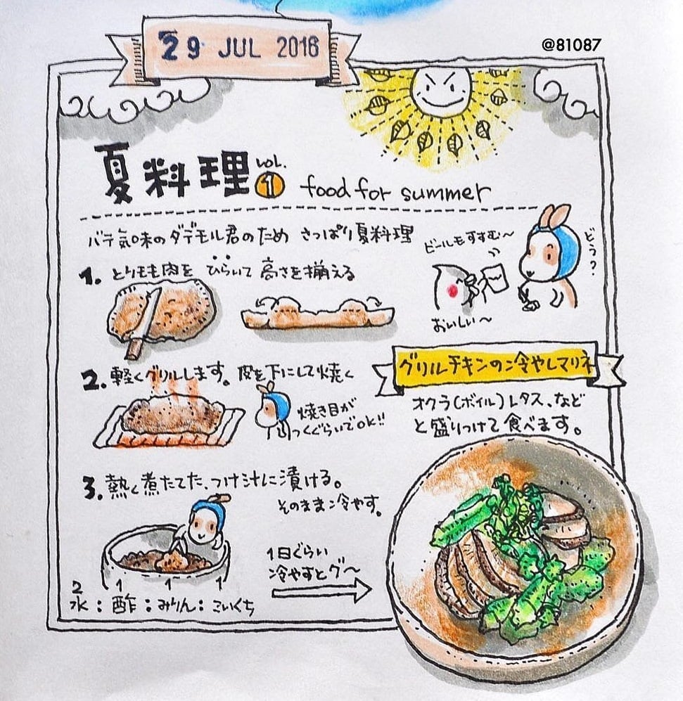 而且除了紀錄一天的大小事之外,うさうさ的插畫日記也會分享料理的做法與過程,大多都是很適合炎熱夏天的涼拌料理,像是這道餐點就只有三個步驟,首先把肉拍打均勻之後,再拿去火烤幾分鐘目測熟,最後依照水:醋:味醂:濃縮醬油以2:1:1:1的比例醃製,放置一天就可以囉!