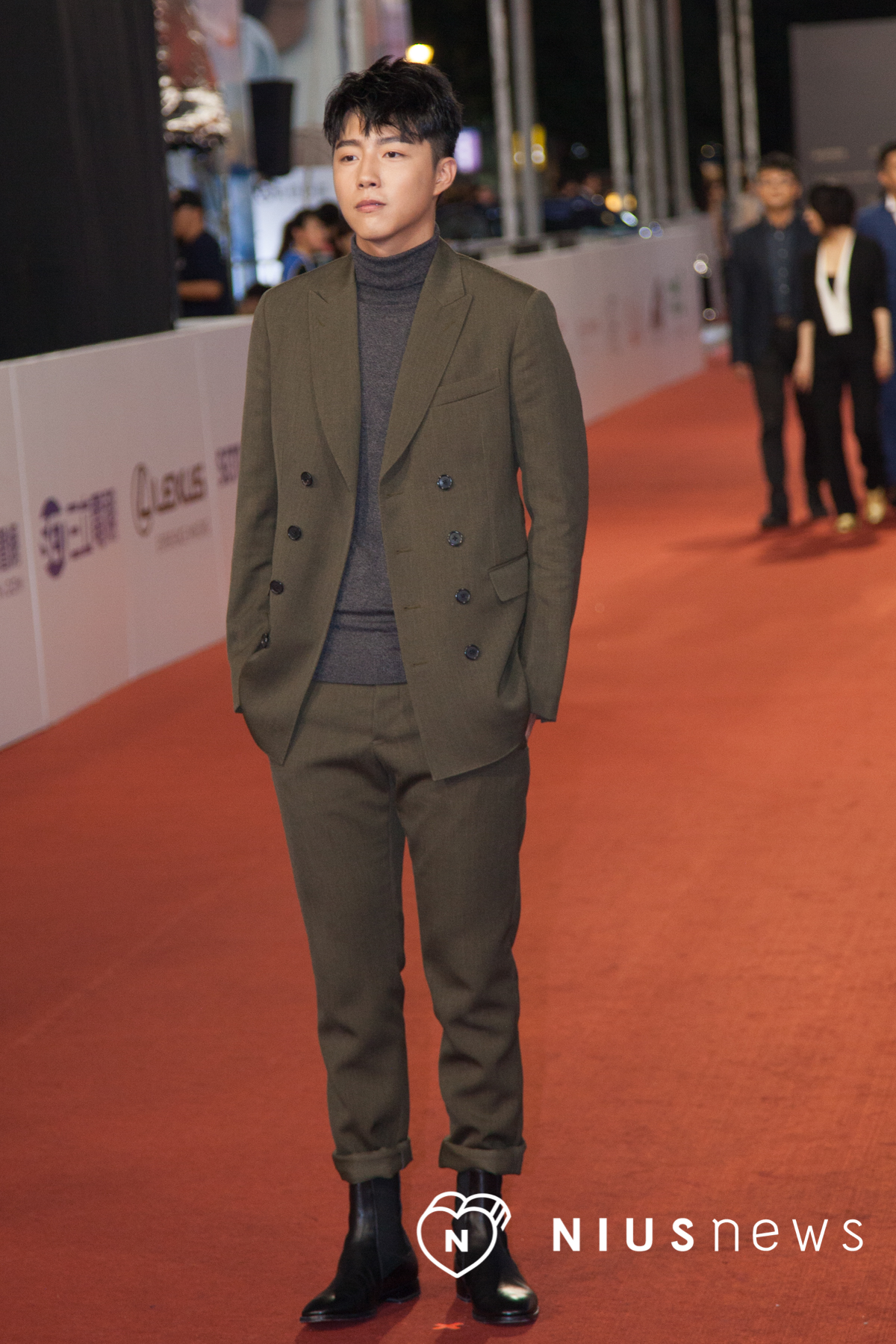 今年最受矚目之一的新人蔡凡熙,以《通靈少女》入圍最佳新人獎(少女們尖叫吧!)他穿著墨綠色西裝,腳踩黑色軍靴,算是本次非常敢穿的男星之一,不過他在裡面搭上一件厚實的灰色高領,相信在這天氣穿上冬裝,蔡凡熙一定滿身是汗吧!實在太敬業了啦~