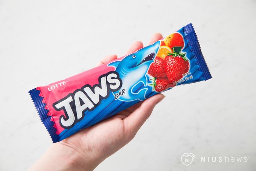 登登~~鯊魚字型的冰棒就連口味也超級消暑的!灰色的部分是蘇打飲料,氣泡涼感化在口中超暢快,裡面還包著草莓橘子冰的內餡!(不只視覺超可愛,就連口感也非常沁涼~)先讓妞編輯玩一下這可愛的鯊魚冰再把它一口氣消滅掉XD
