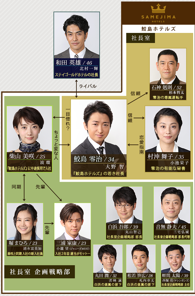 除了男女主角都是收視保證外,配角們更是來頭不小,從擔任貼身秘書一角的小池榮子、競爭對手北村一輝,還有對師兄大野智有著濃烈的愛意(?)的師弟團ジャニーズWEST小瀧望,也是首次出演電視劇,後續劇情走向也令人很期待!