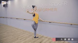 接著將雙腳打開,並往下蹲,做PLIe”。重複八次之後,再將小腿收進來,手往上抬。