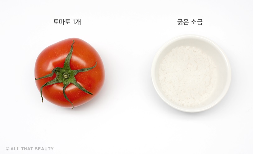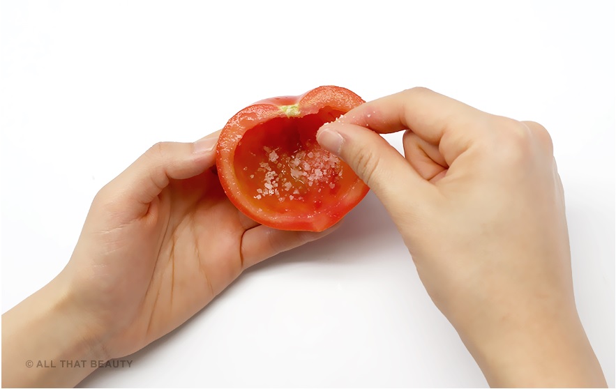 番茄含有AHA成分可以有效去掉角質,去掉番茄的果肉後,在番茄內撒上顆粒較粗的鹽巴。