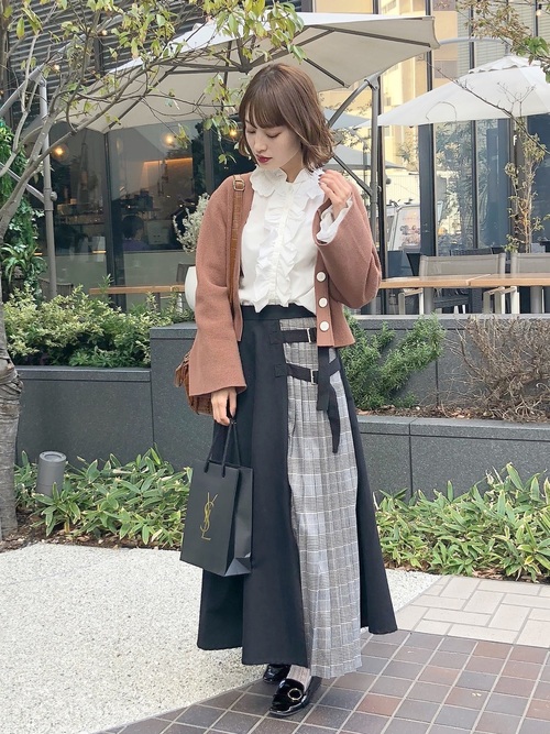 黑色拼接格紋的傘裙設計,一件擁有亮眼特色的單品,簡單搭配黑色高領或是白襯衫都會有不錯分數的好感度。
