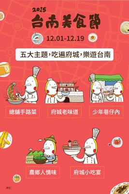 台南市政府觀光旅遊局舉辦之「2015台南美食節」,將於12月正式登場,規劃「總鋪師手路菜」、「府城老味道」、「少年巷仔內」、「農鄉人情味」、「府城小吃宴」等五大主題活動,更邀請知名美食家魚夫、梁幼祥、徐仲與王美霞等人擔任說菜人,讓民眾品嘗美食時,更為佳餚帶來精采故事。