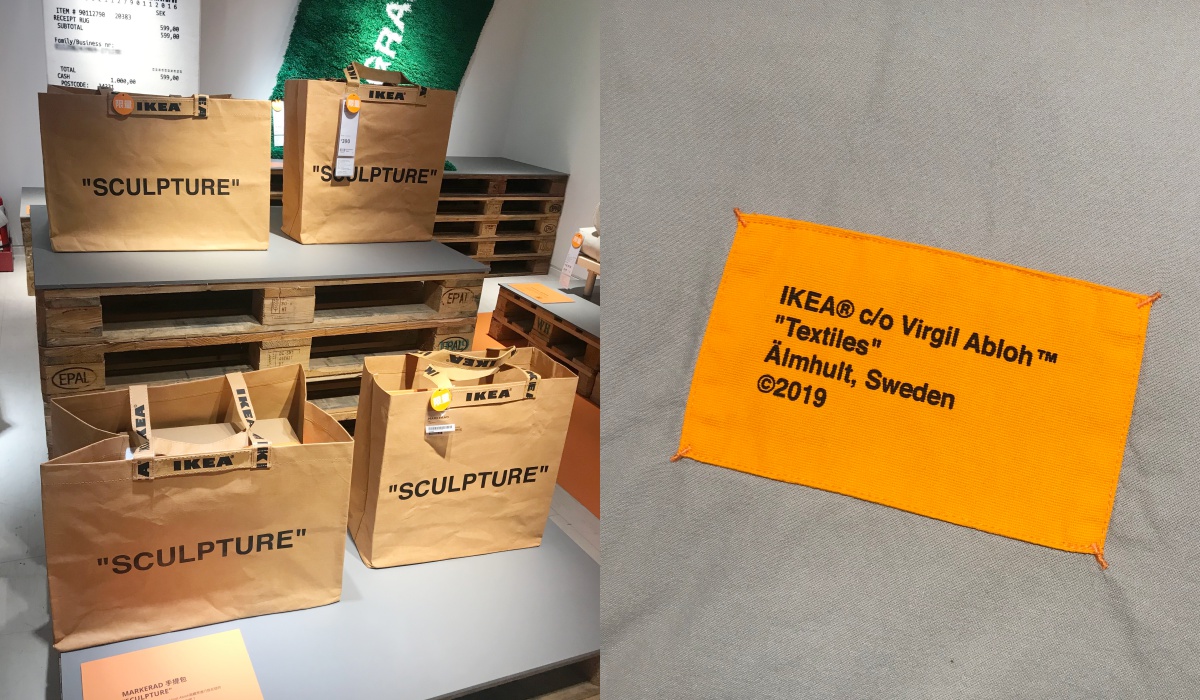 提到Off-White當然不能忘記他們的招牌「""」引號標語設計,這次的聯名系列都可以看到這樣的標語元素或是標籤設計,為家裡隨處可見的小東西天朝流感,像是購物袋包身上印的「“Sculpture”」字樣或是枕套、床組上的標籤設計!