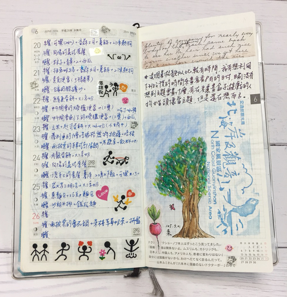 2016年因為這本日記的完成度是百分之百,改而使用A5的HOBO全年冊,因為紙張可以書寫的筆類多了,使用了一些不同的鋼筆來書寫,也正式踏入了文具大坑!買了很多的文具,紙膠帶、貼紙、鋼筆、各種中性筆等等,A5的版面比較大也更適合貼一些素材跟紙膠帶,於是版面就多了很多裝飾,慢慢的也開始學習拼貼,看IG等等的分享,只是如果一但沒時間寫的時候要補手帳也比較痛苦一些,而且因為太重無法帶出門。