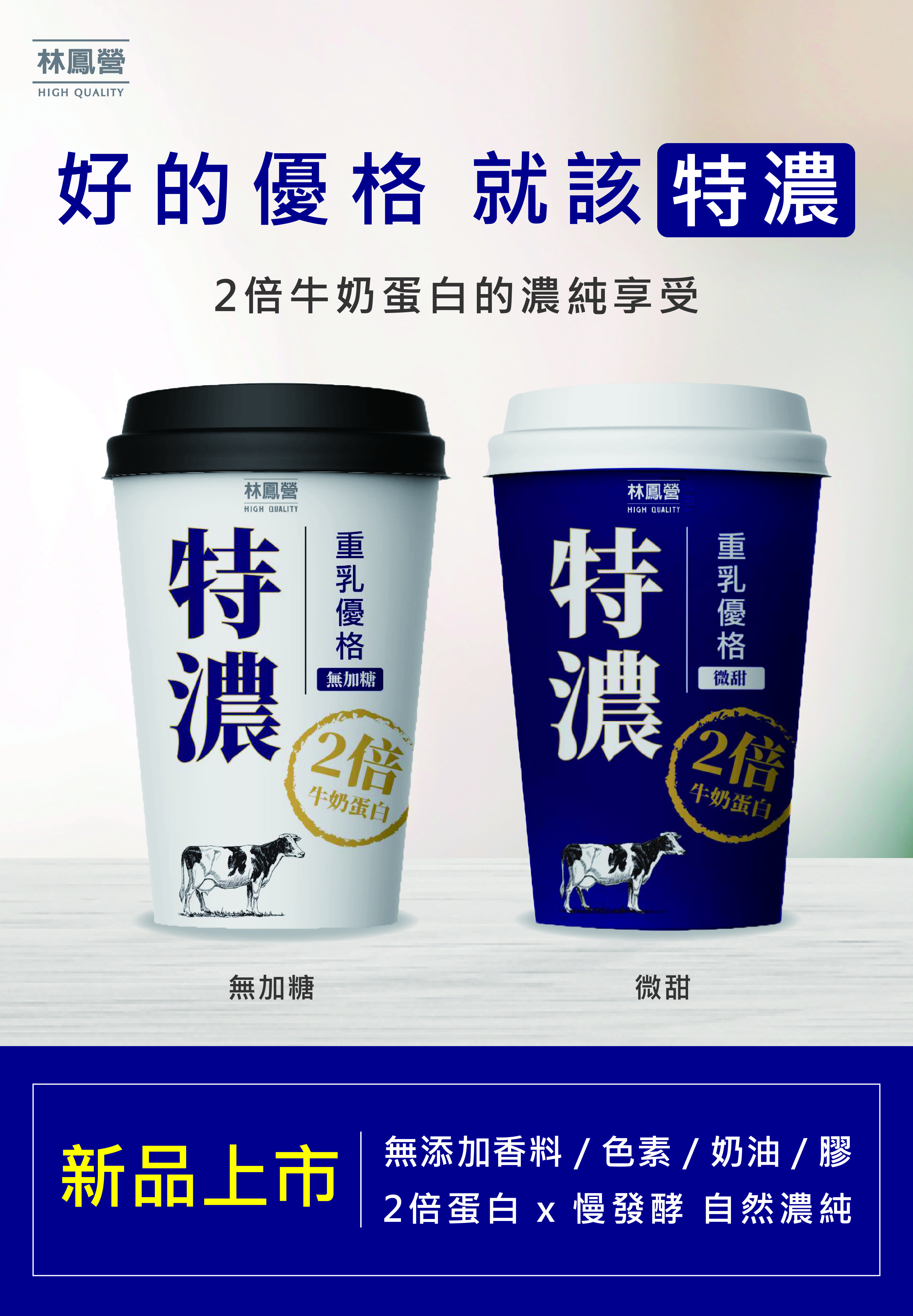 你也愛吃優格嗎?今夏新品「林鳳營 特濃重乳優格」,令人驚豔的濃純細緻口感,與含有2倍蛋白質*的高營養價值,甫一推出即熱銷上萬杯!堅持以簡單的成份,呈現自然、真材實料、健康的好優格,以高含量牛乳與慢發酵工藝,不添加香料、色素、奶油與膠,造就出自然綿密的特濃口感,每一杯(400g)還可以滿足每日所需蛋白質的三分之一*,健康、享受、少負擔,吃一口就愛上!