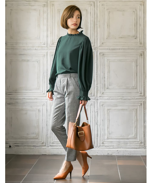 秋冬的綠色真的很美~幽幽地透出優雅氛圍,卻又不失休閒的不羈感,帶有女性線條的蓬袖上衣搭配灰色格紋褲,既簡約又能展現個人品味。