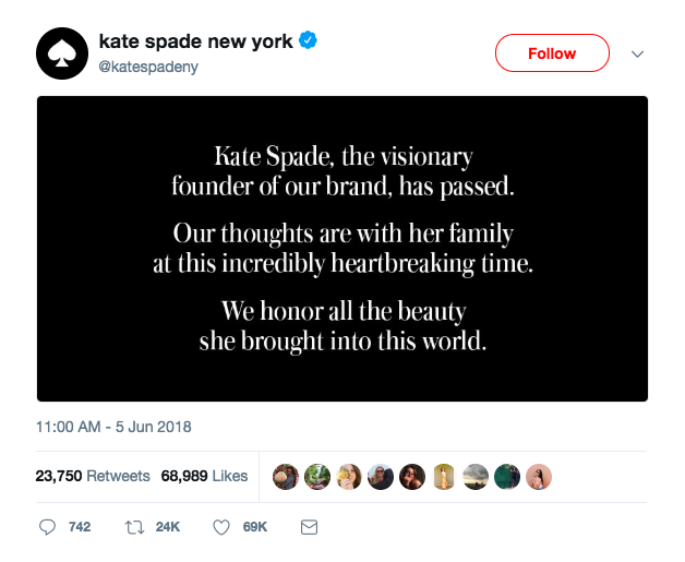 Kate Spade的官方推特也發文證實此一噩耗,表示會永遠記得這位品牌創辦人與設計師,謝謝她帶給這世界的美好。