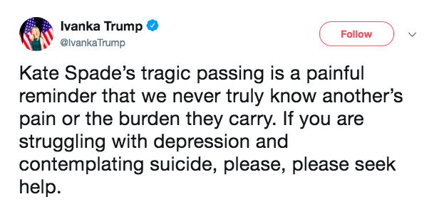 許多網友都在社群網站上發文哀悼,包括美國總統川普的長女伊凡卡(Ivanka Trump),也在推特上發文悼念這位傳奇設計師,她在推文裡寫道:「Kate Spade的逝世提醒世人,我們永遠無法真正了解他人的痛苦或正在承受的壓力。如果你被憂鬱症所苦且想過要自殺,請尋求協助」