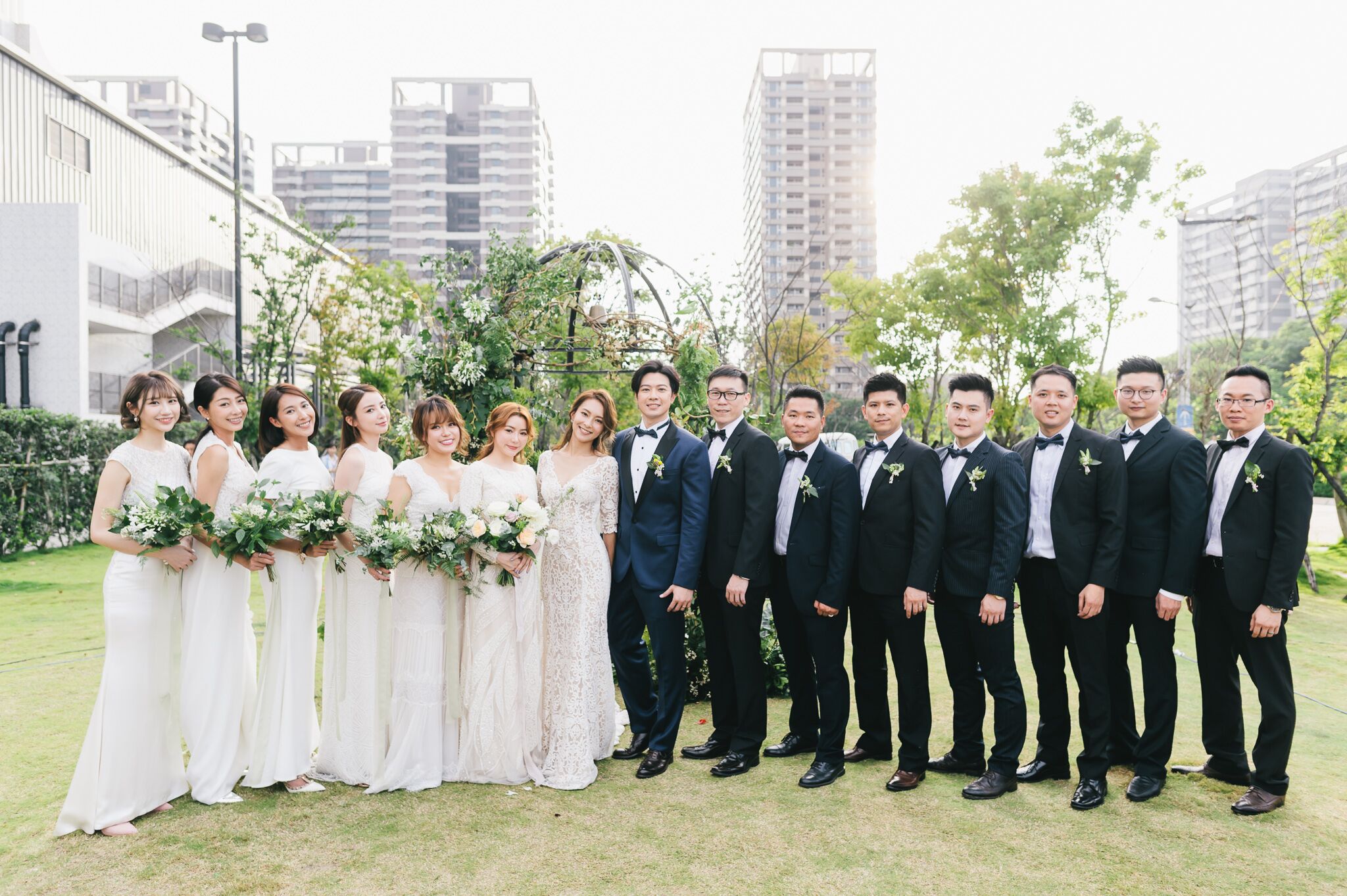 純白、米白色調最百搭!照片中藝人-陳瑋薇的婚紗與伴娘團的禮服就是清一色的米白色系,而亞洲膚色也容易駕馭中間色調,例如灰藍,灰綠,藕粉,有柔焦效果:有些難駕馭的色調比較容易失敗,例如桃紅,寶藍,天空藍,紫,會讓膚色顯得更黃或暗沈。建議可以選擇同色調的衣服,讓每個人穿不同深淺的同色系可表現層次感。