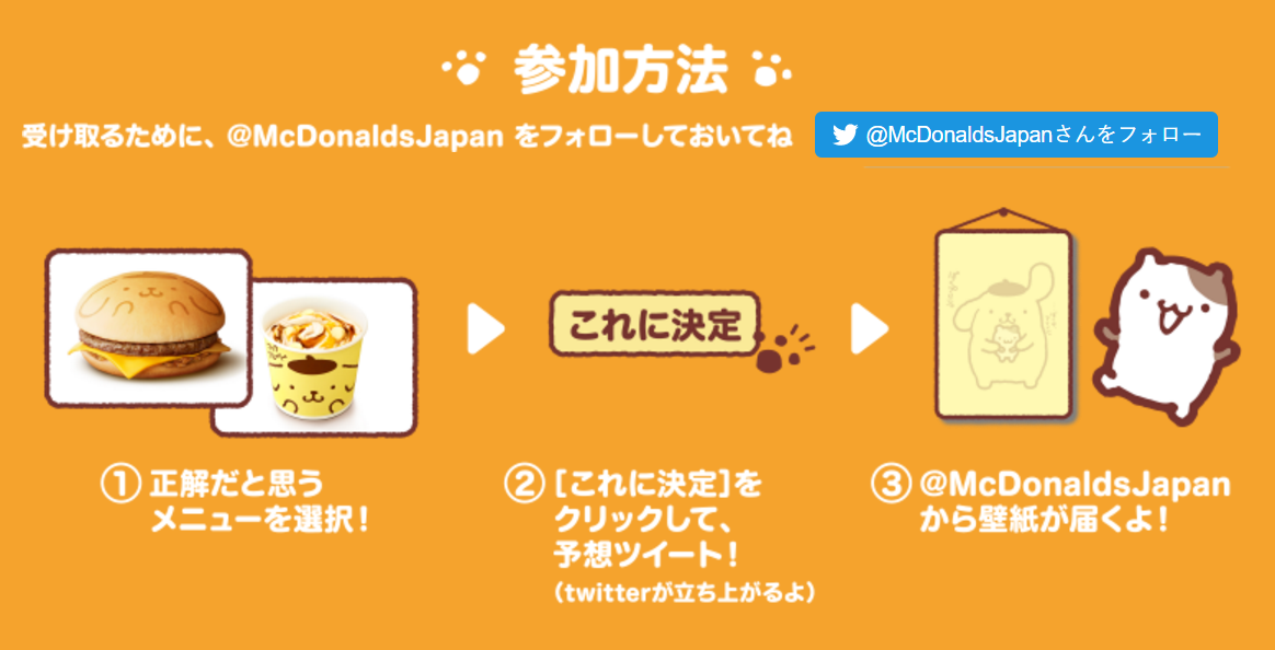 不過以上這5款布丁狗餐點並非全部都會販售,而是要交由大家一起到麥當勞官方Twitter投票、tag字樣(マックのポムポムプリン),選出這之中你最喜歡、最期待看到它實體化的一款,就能成功參加投票,且還能獲得布丁狗的手機桌布呦!