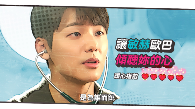 《醫療船》男女主角姜敏赫與河智苑的感情發展終於趕上進度,身為心臟科醫師的姜敏赫把智苑歐膩拉到自己身邊,拿起聽診器為對方「看診」,曖昧地問:「妳的心跳已經超出正常指數範圍,妳的心臟是為誰而跳呢?」根本就是最高招的撩妹招數,這個冬天如果有敏赫歐巴一樣的人傾聽妳的心,絕對馬上中招,暖心指數五顆星,不能再高了!