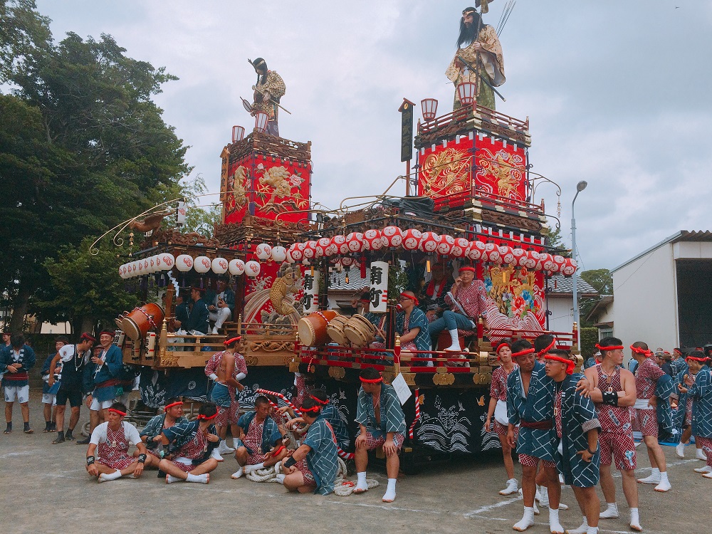 看完「神輿」後,我們走了一段路抵達有「山車」和「御船」的地方,跟方才的神輿不同,這裡的山車是以華麗裝飾為主,最上方還有神明的人偶佇立著,一群人在上面打鼓、吹笛子,用歡快的音樂助陣祭典。