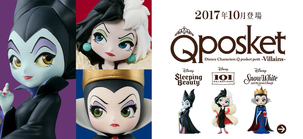 這些有著可愛大頭、和一雙無辜雙眼的Q posket公仔,不管他的原型(?)是怎麼樣,再兇狠、再有氣勢也都瞬間變得溫馴又可愛。像是這次10月主打的三大反派─壞皇后、黑魔女、庫伊拉,成品完全顛覆各位的想像,每一隻都萌到不行。