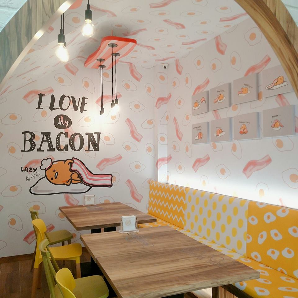 另外內部座位區也是很精彩,在「培根包廂」牆上,是一個個蓋著培根被被的蛋黃哥主廚們,而抬頭一看,連吊燈都是培根造型的呢。