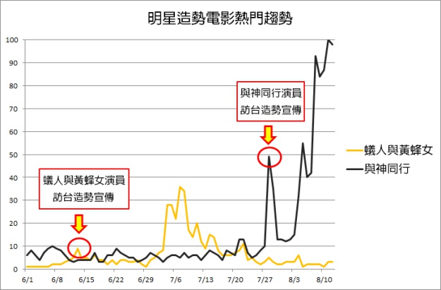 單看與神同行的熱門趨勢還無法明顯感受觀眾的關注度究竟有多強,所以將前陣子明星來台宣傳的《蟻人與黃蜂女》拉出來做對比,漫威電影往往是媒體宣傳的焦點,演員訪台更是電影圈的大新聞,兩部是暑假唯二有影星來台宣傳的強片,在宣傳方式和市場待遇上也有諸多類似,作為比較對象再適合不過了。