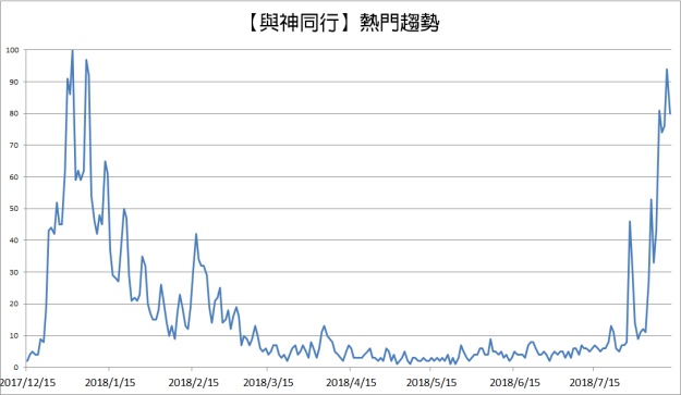7月底東森電影台播出《與神同行》後熱搜度瞬間飆高,之後主演員們大陣仗來台做宣傳掀起一陣韓風,連前陣子獨挑大樑《冠軍大叔》的馬東石都特地為了與神同行而來台造勢,各大媒體爭相報導為電影做了最大的宣傳,熱度也來到上映前的最高點。