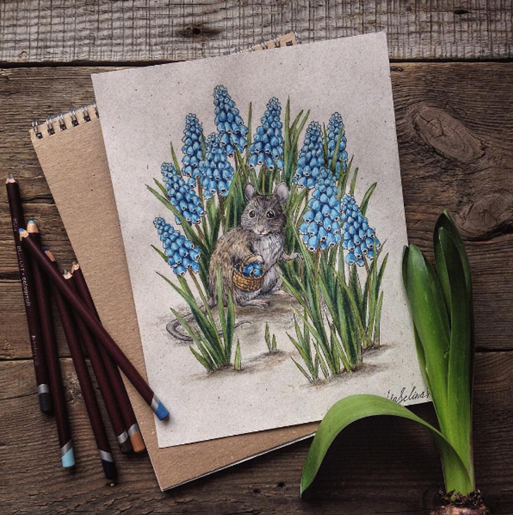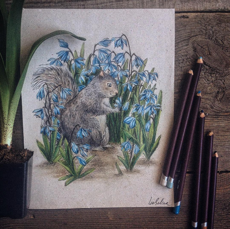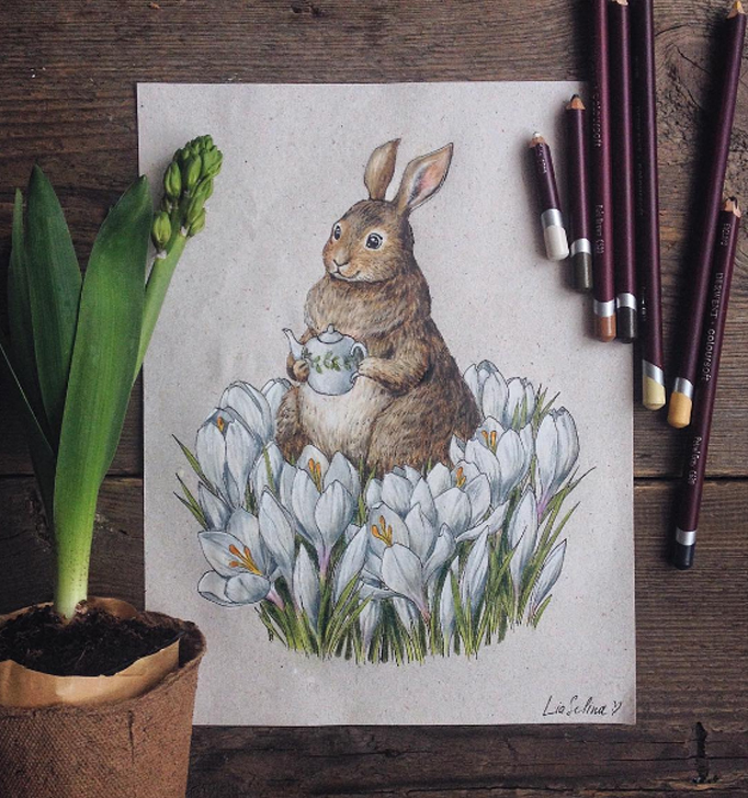 這位叫作Lia Selina的插畫家來自俄羅斯,她所繪製的作品都以手繪的方式呈現,使用的材料為色鉛筆。她的作品特色就是帶著鮮明的童話色彩,人物則多半以動物為主,並以擬人的方式呈現。