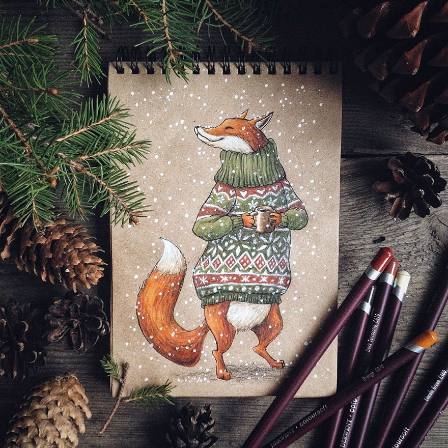 其中這一系列動物穿著毛衣的畫作最受到注目,即使畫面飄著雪,但動物手中都握有一杯熱飲,如果在寒冬看見這樣的畫作,心裡或許也會有一股暖流油然而生呢。