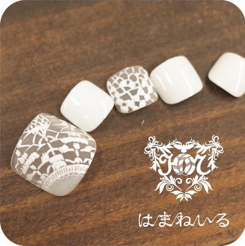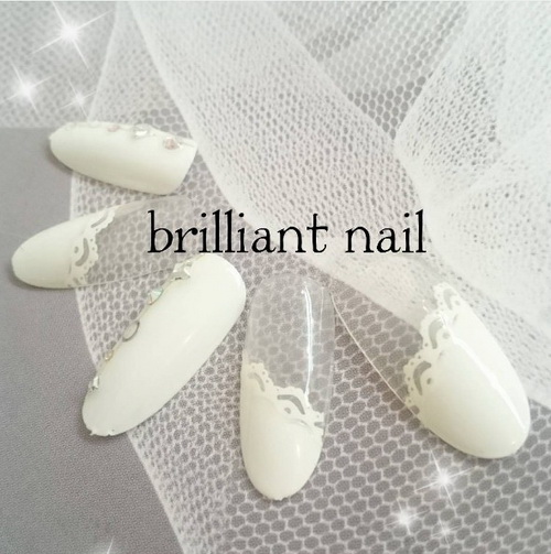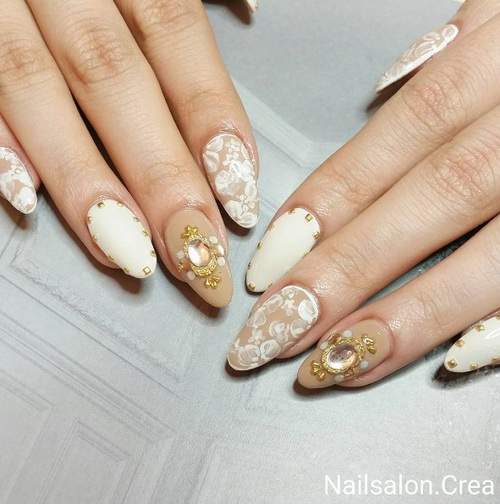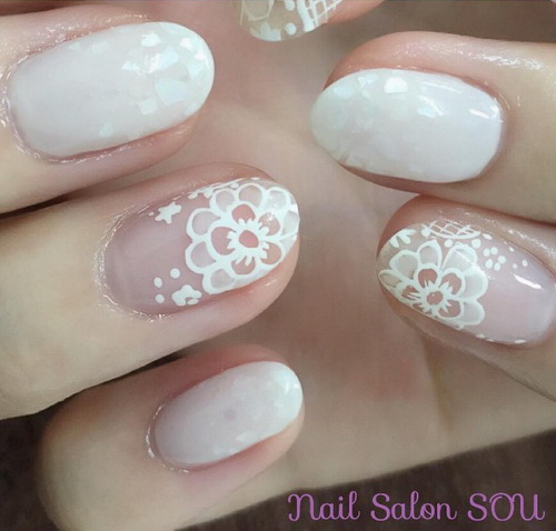個性比較浪漫、溫柔且喜愛日系風格的新娘子,則不妨試試這種利用真的蕾絲當作裝飾並搭配偏霧面的底色指彩設計。