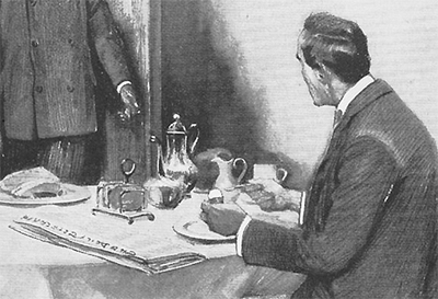福爾摩斯系列中並未出現過「土司、咖啡、水煮蛋」等早餐情境的插圖,相當可惜,不過福爾摩斯故事的插畫家西德尼‧佩吉特,曾經為偵探小說「Martin Hewitt」 系列,描繪過早餐的餐桌情景(圖3)。圖中人左手端著放入蛋杯裡的水煮蛋,右手拿著小湯匙,正準備開動。桌上除了有咖啡壺、土司架以外,還有報紙與類似肉塊的餐點。隨時都能吃到「帶骨大塊牛肉」的貝克街二二一B的租屋生活,雖然租金稍高,但的確是逍遙快活呢!