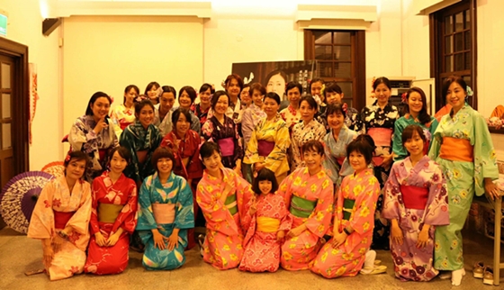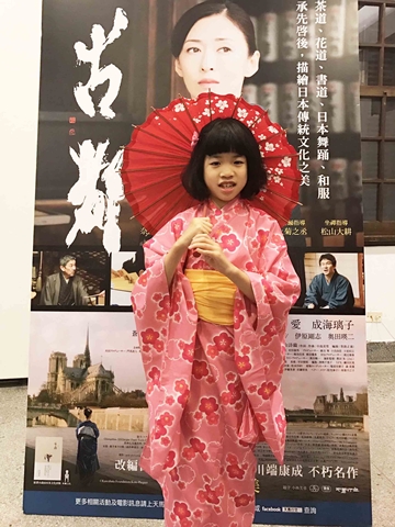 今日雖然天候不佳卻也未能澆息大家的熱情,參加者仍然相當踴躍,現場也準備好多套精致和服、頭飾、團扇、木屐,一應俱全!參加者們在老師的指導與彼此幫忙下,都順利的體驗完整的日本浴衣裝扮,直呼:「雖然穿的過程有點困難,但是好不容易穿起來之後真的覺得浴衣好美,走起路來步伐也自動變小,簡直就像真的在日本一樣!」更有年僅九歲的小妹妹也參加這場體驗活動,並開心的說:「今天早上我有去看電影,超喜歡的,電影好美麗!」