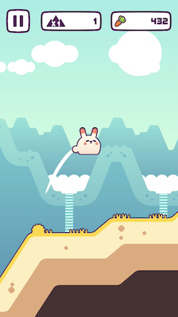不過這隻兔子蹦蹦跳的地方並不是一般的平地,而是山谷,在過程中會遇上許多斜坡,如果兔子的著地點位於斜坡上,那遊戲就會宣告結束⋯⋯所以得掌控兔子的「軌道」,才不會讓牠因為停在山坡上而滾下來。