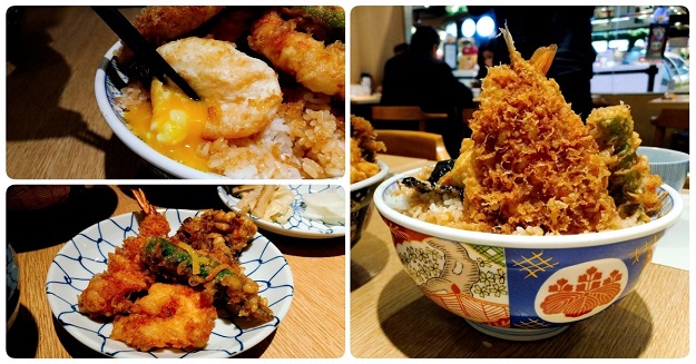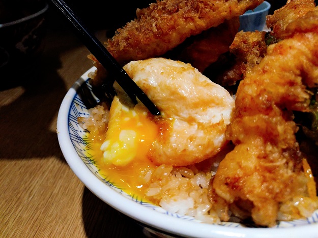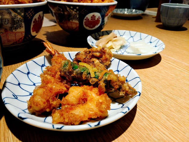 尤其是擺滿各式海鮮的天婦羅丼飯,鮮蝦與魷魚整尾、整塊地擺上,將白飯蓋好、蓋滿,如果一不注意夾取的角度,還會有食材從碗邊掉了出來,天丼就是要這樣華麗又豪邁,吃起來才夠爽快!