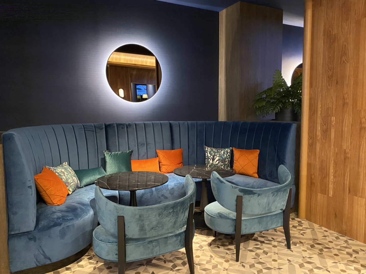 吃飽喝足後,夜晚的美好時光當然也不能放過!飯店中同樣也有海洋風格的「Blu Bar」,且外觀採用船艙造型,裡頭不僅設有休息區還有飛鏢機與遊戲區,而酒吧內則有雙人高腳桌椅、小型圓桌沙發等,且皆陳設著各種繽紛的靠墊、抱枕,強烈&鮮明的色調給人滿滿的摩登感,彷彿來到西洋電影中常出現的酒吧,想要悠然放鬆還是盡情狂歡都沒問題。