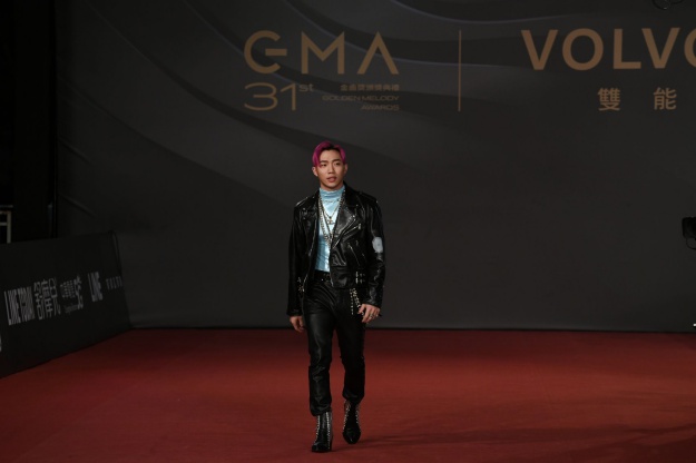 ØZI今年不走紳士路線,反而要以Rocker的精神走上紅毯。他身穿黑色皮革外套×皮革褲,內搭挑選水藍色緊身上衣,跟桃紅色髮型雙雙搶眼,整個人超級吸睛!另外胸前的項鍊完全沒在客氣,能帶多少條就戴多少條(笑)