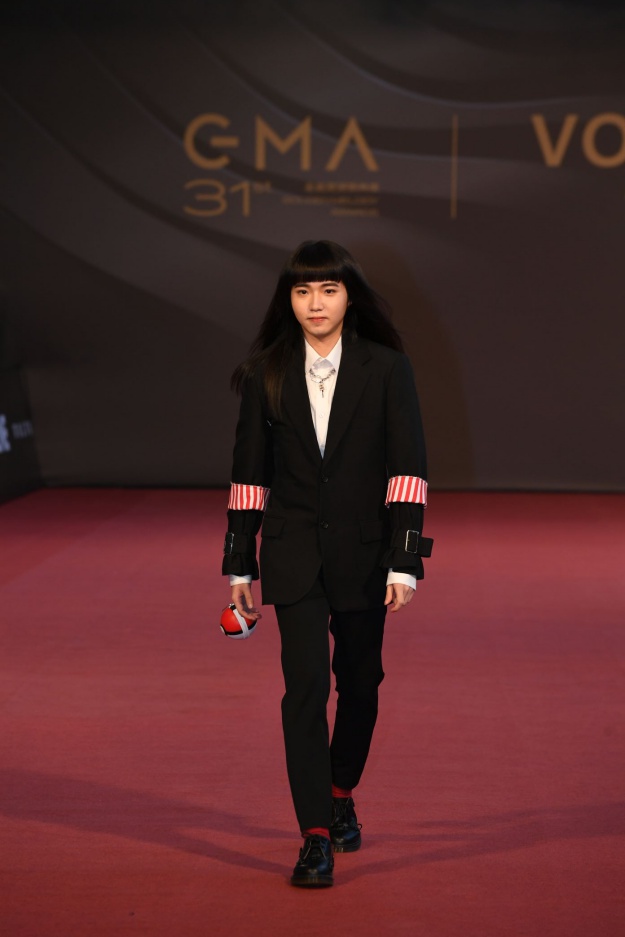 持修一走上紅毯相信很多女孩們都開始尖叫,覺得他實在是太可愛了!紅色條紋袖口的設計讓全黑的西裝看起來更加亮眼,而且不繫領帶反而戴上今年最流行的鎖鏈鑰匙項鍊,加上手上拿的神奇寶貝球小包包,完全是可愛×可愛的組合!