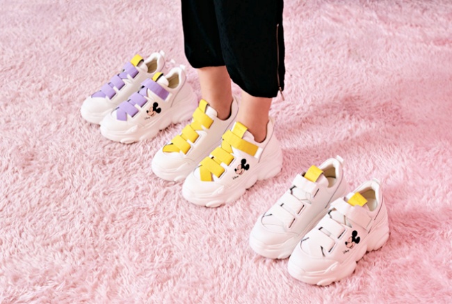 除了有比較中性版本的全白老爹鞋,新一波聯名系列的話題鞋款就是這雙…「胖鞋帶增高老爹鞋」!鞋側不只有可愛的米奇大頭、超厚鞋底,鞋帶還採用「超粗設計」,加上粉嫩的鵝黃色或是薰衣草紫,可愛度一路狂飆,連演員李侑菲、奇恩世的OOTD踏上出鏡,更是韓妞瘋搶的重點商品。