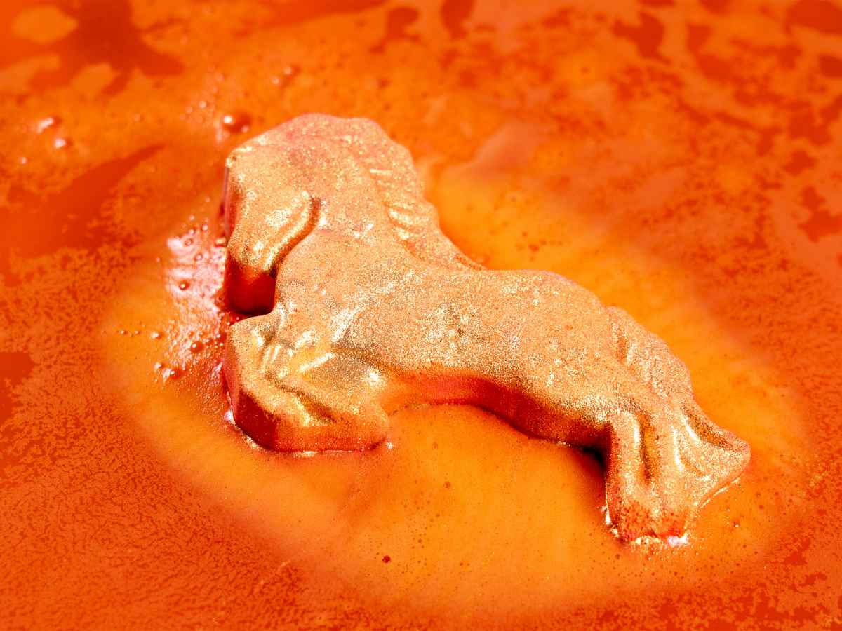 『人中呂布,馬中赤兔』以呂布一代神駿聞名的赤兔為靈感,LUSH推出馬年限定新品「馬到成功汽泡彈」,讓駿馬在暖浴中奔馳而過,金光閃閃的紅橙光影象徵繁盛和福氣,泡澡時散發柑橘與香檸檬的明亮香氣,祝福大家能以全新姿態奔向新年,迅速有力地實現目標。