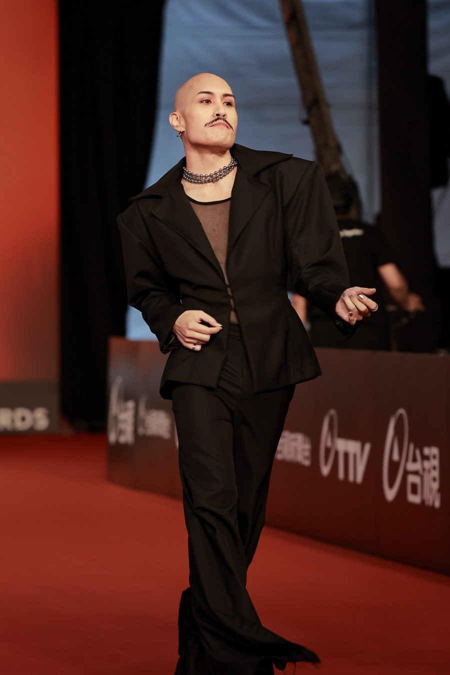 身兼本屆金曲紅毯主持人與入圍者,黃宣的造型不改浮誇本色,一身黑的超大墊肩西裝外套,搭配開衩大喇叭西裝褲,內裡搭配的是略帶性感的黑色薄紗透膚上衣,在同色系的穿搭之下也能展現豐富的層次感。