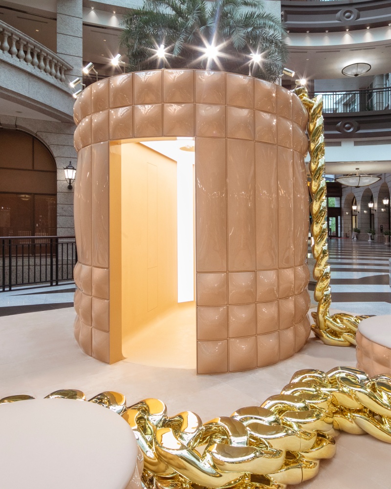 BURBERRY這次為品牌推出的Lola包限時快閃店整體就像是一個Lola包的擬真巨大化,店內的空間裝置都是以包身上穿插的格紋設計,再選用溫潤夢幻的英式奶茶色系打造整體感,包身的金屬鍊帶以奢華金色放大呈現,從空間到色系都是揉合了品牌經典元素及現代感,無論是身在其中或是在遠處都會被這漂亮的快閃店吸引!