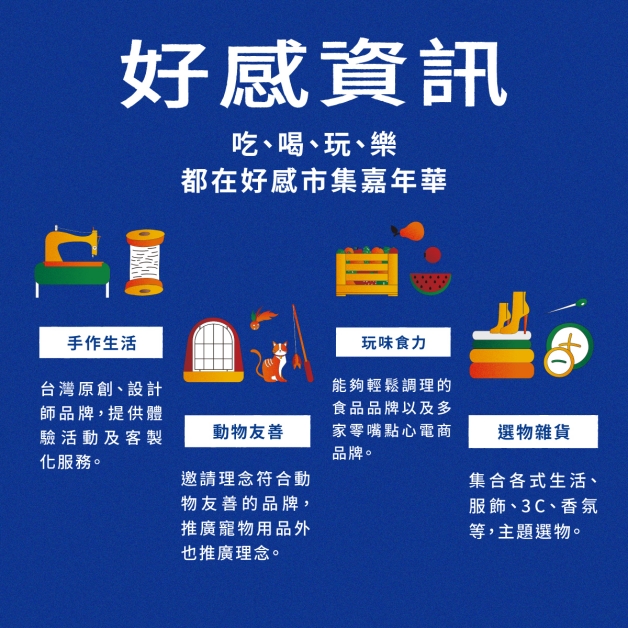 說起市集絕對不能不提「攤位」,分成手作生活、玩味食力、選物雜貨和動物友善四大類,「手作生活」為台灣原創設計、「玩味食力」包含零嘴和飲料等食品、「選物雜貨」以居家用品和生活好物為主、「動物友善」推出寵物用品和食品,包含許許兒、Nininono、光景 Scene Select、貳樓有花、Fun-Maker、CATISS和100K select等品牌都將進駐!