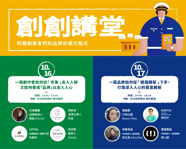 除了兼具吃喝玩樂之外,也特別舉辦「創創講堂」,力邀台灣指標電商品牌分享創業故事,並結合市集策展經驗分享,第一天10月16日週六主題為「創作者如何從市集走進『人群』,又是如何靠電商走入『人心』」,講者為好米芽、川涌果園、Catiss和許許兒;第二天10月17日週日則是「告訴大家如何從『開箱體驗』下手,打造深植人心的驚喜體驗」,講者為林果良品、妞新聞、BoxFul和驚喜製造,每場次限額50名!