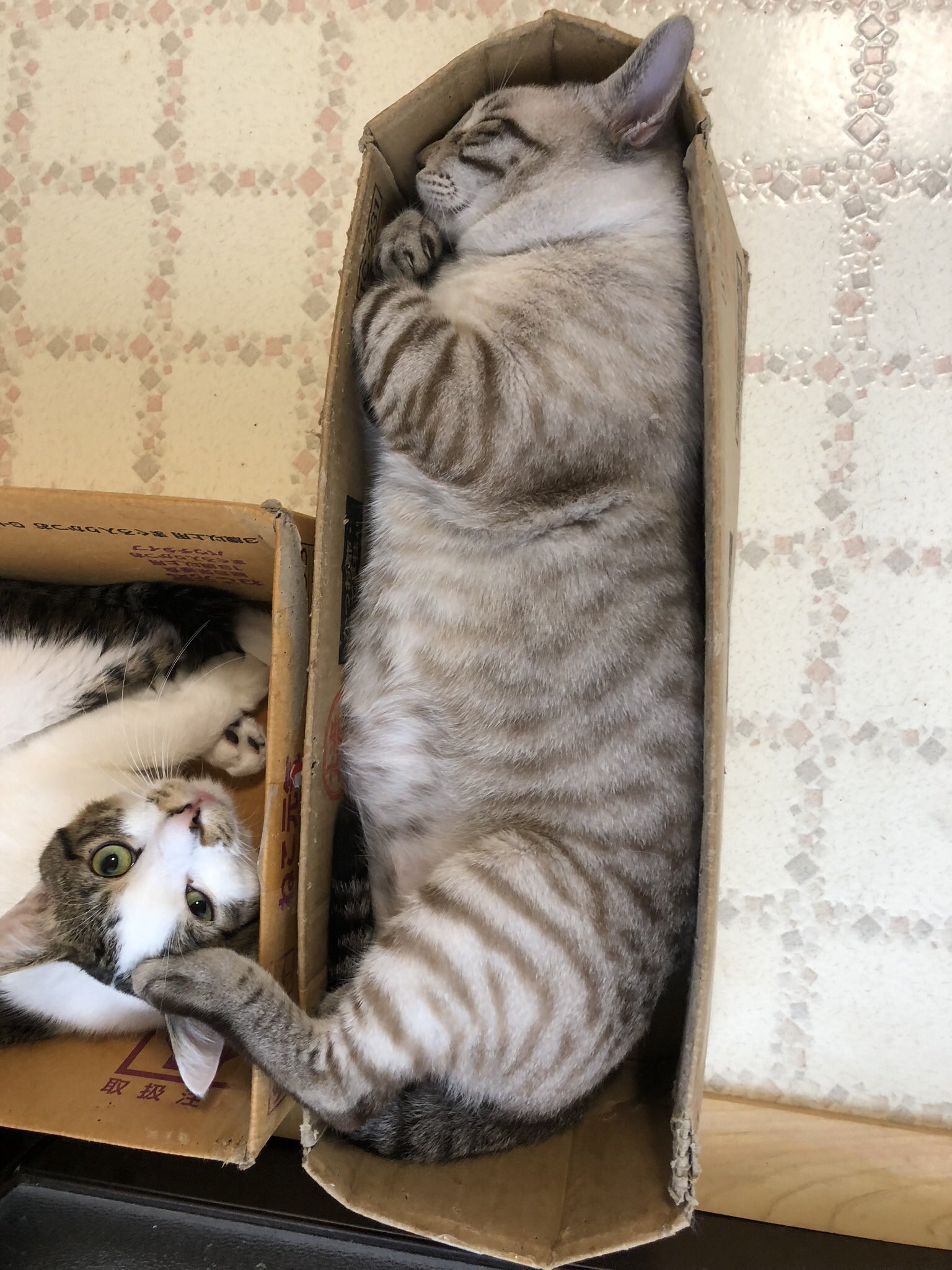 有天飼主在家中要下樓,在他從2樓要走到1樓的途中,這狹長的樓梯就被三隻貓給填滿,所以現在飼主要下樓是需要扶牆+顛腳嗎?而這兩隻虎斑+黑貓橫躺在樓梯間,不只方向一致,連體型都那麼相似,看來鏟屎官給了大家公平的愛,要胖大家一起胖!(但這真的是陷阱吧?)