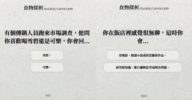 最後結果會顯示大家的代表食物,像是喜歡寧靜「你的長相茶碗蒸」、充滿情感和理解的「敏銳感知雞蛋糕」、有清晰頭腦和分析能力的「超級自我可樂餅」、熱情感性且喜歡分享的「超派人生雞排」,並提供XY軸的「理性感性」和「內向外向」的向度!