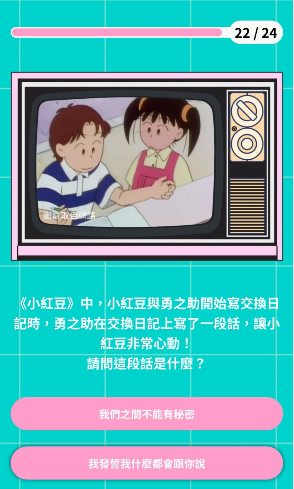 第十八題「《小紅豆》中,小紅豆與勇之助開始寫交換日記時,勇之助在交換日記上寫了什麼,讓小紅豆非常心動?」妞編輯當時也被他的這句話撩到了呢(羞)。