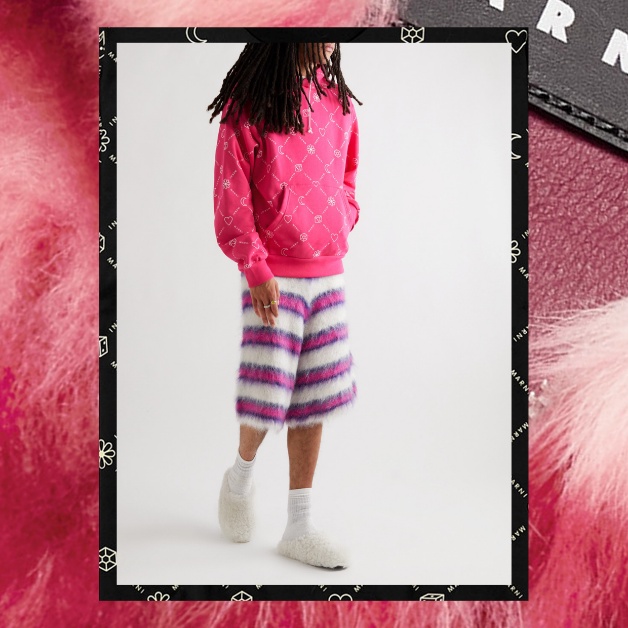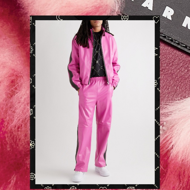 連帽衛衣、手套及帽飾以毛茸茸的長毛羊皮巧製,披上獨家的粉紅色及紅色,向Marni在物料及圖案方面的實驗精神致意。與此同時,天然納帕皮革運動服披上MR PORTER獨家的洋粉紅色,衣袖及褲腳綴上學院黑條紋。