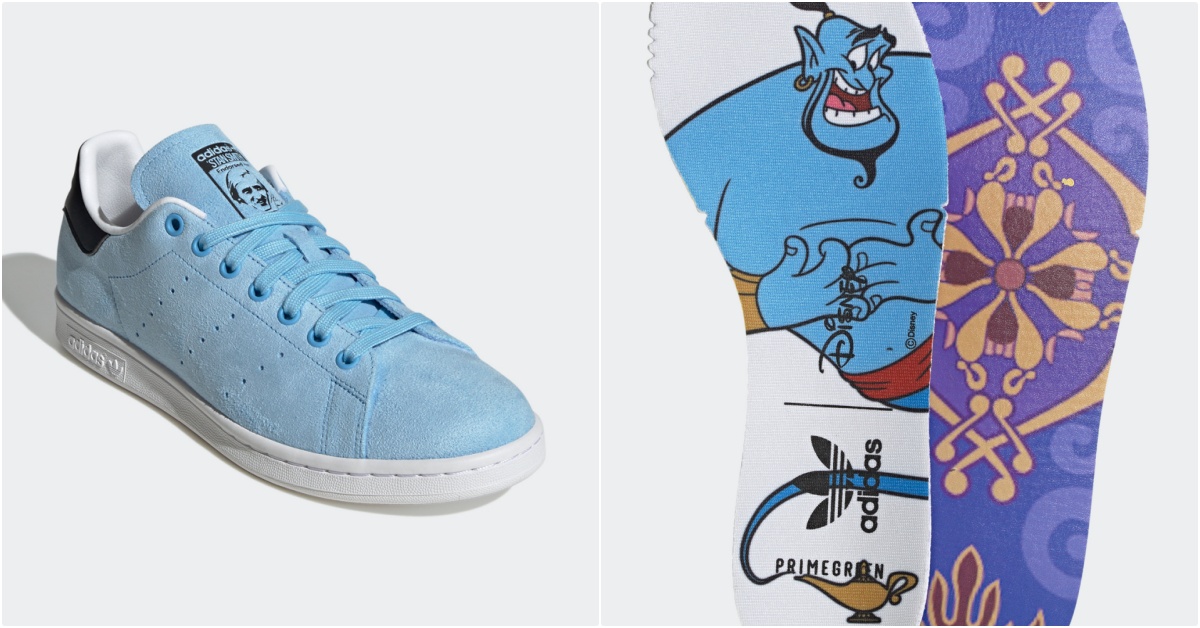 蒂安娜款以招牌服裝的代表色系淺綠與鵝黃色點綴在鞋舌與鞋跟上,搭配全白皮革鞋面,簡約又有梗!《阿拉丁》神燈精靈鞋款則是「一看就很想許願」(笑),Stan Smith整雙變成精靈藍,搭配麂皮材質、異國花紋鞋墊,抬腳就能招喚鞋底的精靈!
