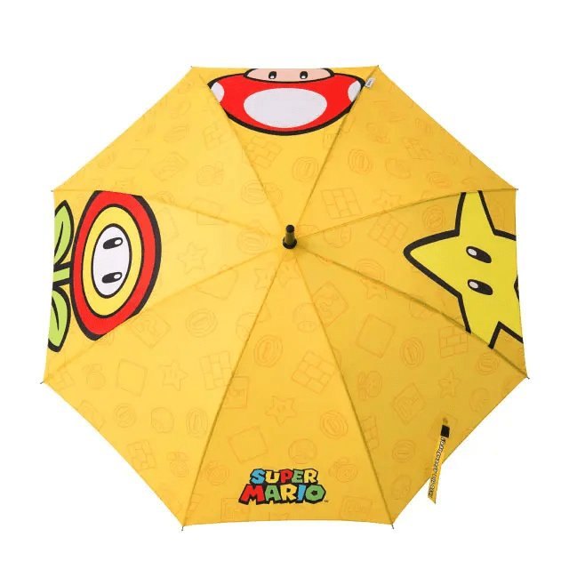 撐這把傘出門絕對會被看好幾眼!鮮豔黃色的傘面上,除了集結了無敵星、火之花和蘑菇,仔細看還藏有滿滿的金幣,大傘面下大雨很夠遮。