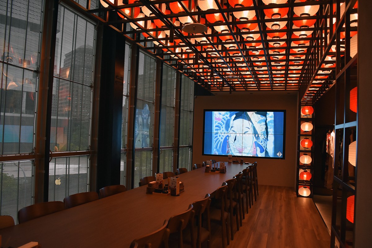 筑前屋信義旗艦店不只關注人心,更可見濃厚的時代風情,空間設計援引日本居酒屋濫觴的江戶時代,從大江戶時代的奢華慶典汲取靈感,融入信義商圈繁榮、熱鬧的氣氛,以氣派的鳥居入口、多達600盞絢麗的紅白燈籠、祈福用的繪馬牆和仿舊啤酒海報等日本意象,打造出摩登復古、溫暖夢幻的微醺樂園。多元的座位規劃除了舒適的2-6人方桌,還有以啤酒箱加工製成椅子的屋台風座位區、電視牆上播放著人形町、池袋等分店實景的都會觀景區,以及2間純日式風格包廂,豐富的氛圍呈現、滿足不同目的的用餐需求。