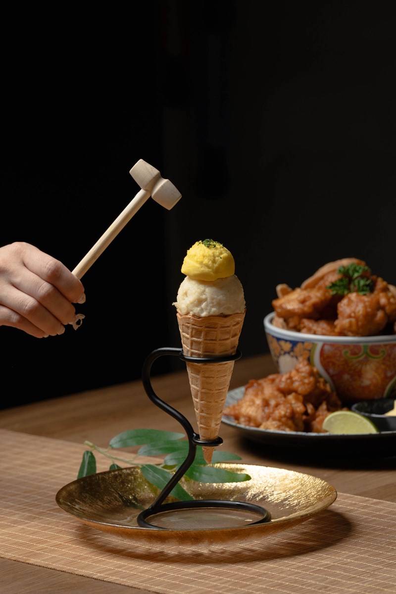 除了「人」的互動、店的風「情」,筑前屋信義旗艦店更力求原汁原「味」,總經理葉盈吟說:「古時日本的九州是由筑前、筑後…薩摩和大隅等九個國所組成,所以筑前屋的強項除了多種口味的豬肉燒串,還有曾經是筑前國所在地的福岡地方料理。」好比以豚骨高湯為鍋底,加入腸類內臟、豆腐、韭菜、牛蒡、高麗菜煮的摩滋鍋,將豬肚、豬舌、豬心舒肥烹調後製作的涼拌菜,皮脆餡多汁的冰花煎餃、豚骨濃湯搭配彈牙博多細麵的福岡炒拉麵等等,都是來到筑前屋的必試經典。另外還有咔滋洋芋甜筒沙拉、招牌番茄多蜜蛋包漢堡排、昭和焦糖布丁的台灣限定料理,以及邀約日本泡芙專賣店beard papa's攜手合作特製的卡士達千層捲,創意與美味兼具,令人食指大動。
